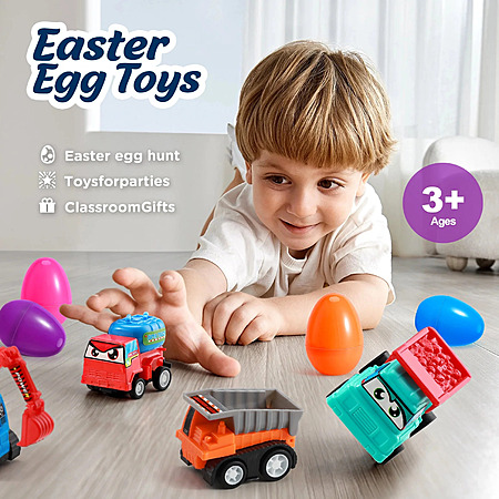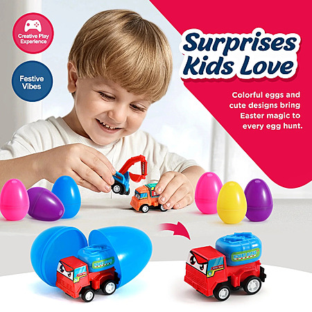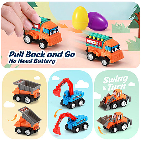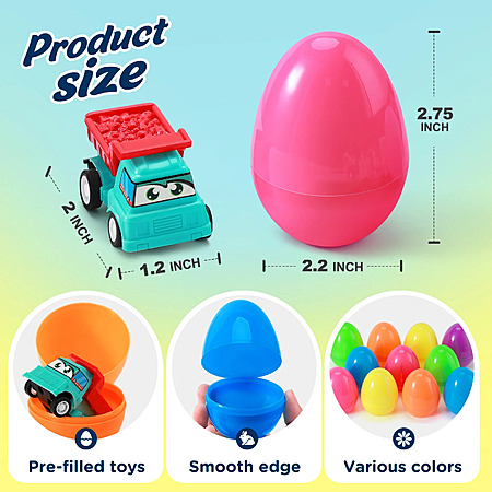 About this item- SUPER VALUABLE SET - Prefilled egg surprise toys includes 12 Easter eggs filled with 12 styles Adorable Pull- Back Construction Vehicles. Each eggs measure 2.75" Tall x 2.2" Diameter.