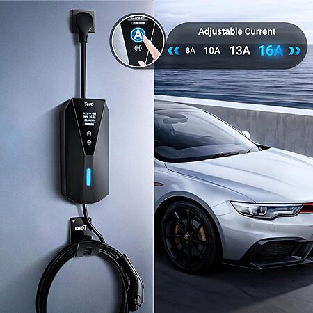 - Adjustable Current: The Tera P01 EV charger provides adjustable ampere settings: 16A, 13A, 10A, and 8A. Charging rates are as follows: 10-12 miles per hour at 16A, 8-10 miles per hour at 13A, 6-7 miles per hour at 10A, and 5-6 miles per hour at 8A. You can use a standard household outlet for Level 1 charging or upgrade to Level 2 charging for faster charging as needed.