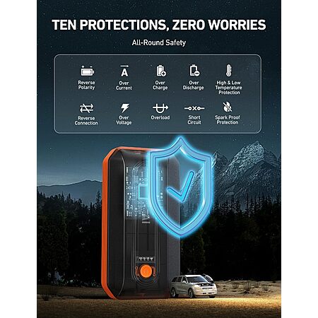 - COMPREHENSIVE PROTECTION: This jump starter offers 10 safety features, including reverse polarity, overcurrent, overcharge, overdischarge, high temperature, reverse connection, overvoltage, overload, short circuit, and spark-proof clamps.