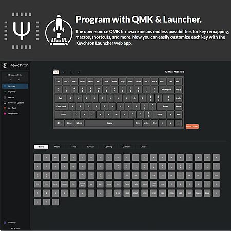 QMK and Launcher Support - The open-source QMK firmware means endless possibilities for key remapping, macros, shortcuts, and more. Now you can easily customize each key with the Keychron Launcher web app.