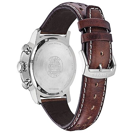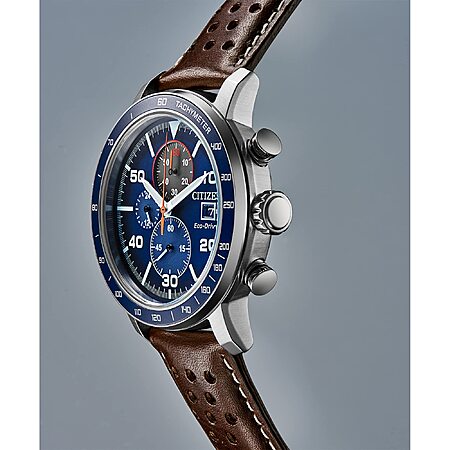 Citizen Men's Eco-Drive Weekender Brycen Chronograph Watch in Stainless Steel, Brown Leather Strap, Blue Dial (Model: CA0648-09L) at Amazon.com $195