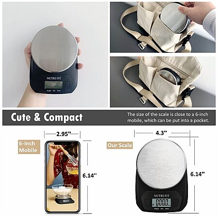 - Cute & Compact: The size of the scale is close to a 6-inch mobile. Extra-slim design makes it easy to store in any cabinet while saving space for the rest of your kitchen essentials. Scale size is only for 6.14 x 4.3 x 1.1 inch.