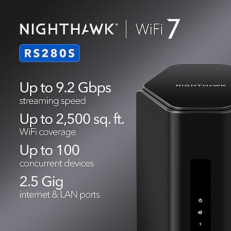 Amazon.com has NETGEAR Nighthawk Tri-Band WiFi 7 Router (RS280S) - Router Only, BE9200 Wireless Speed (up to 9.2 Gbps) - Covers up to 2,500 sq. ft. - 2.5 Gig Internet Port – 1-Year Armor & Free Expert Help on sale for $160. Shipping is Free.