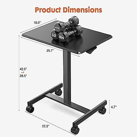 Model: DUMOS Small Standing Desk Mobile Portable Rolling Laptop PC Table on Wheels Adjustable Height Computer Workstation for Home Office, 19 Inch, Black