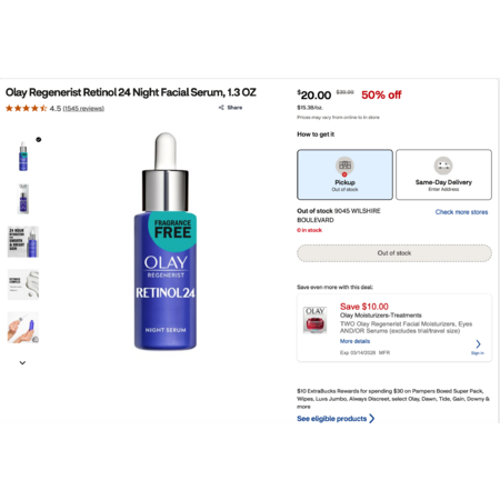 CVS is running a sale : Spend $30 on beauty and personal care and get $10 off. The Olay Retinol Serum is currently at $20 after 50% off. If you have CVS card, follow the instructions below and you'd get 2 bottles for $20 + $10 rewards back.