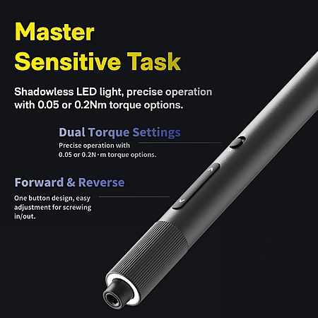 - Dual torque settings: 0.05 & 0.2 Nm for delicate operations