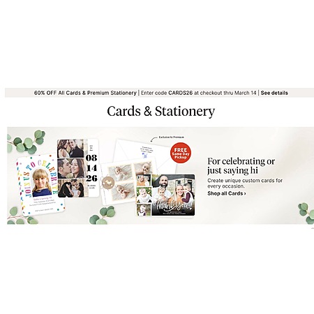 Must use code CARDS26 to receive 60% off All Photo Cards and Premium Stationery through a logged in registered Walgreens.com/Photo online account, in store on photo kiosk or through the Walgreens Mobile App. Code must be entered at time of online, in store or mobile checkout to apply discount. Offer expires at 11:59 p.m. CT on March 14, 2026. Timing is determined by Walgreens server clock. Select products not available through the Walgreens Mobile App. If ordering more than one item, up to three coupons or strike through sale discounts can be used in the online cart. Only one coupon code or strike through sale pricing discount can be applied per item. Account product credits are applied first and cannot be combined with coupon codes or strike through sale pricing. Void if transferred, reproduced or copied and where prohibited by law. Discount does not apply to previous purchases, taxes or shipping charges. Offer is subject to change or cancellation at any time.