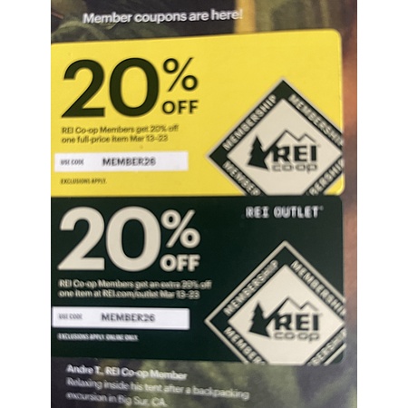 REI co-op members get 20% off one full priced item at REI or the REI Outlet. Coupon code MEMBER26