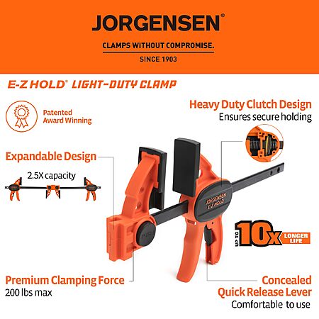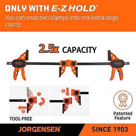 Light-duty E-Z hold design allows clamp to be used in two ways - clamp or spreader. Not only can these versatile Clamps can be easily converted into a spreader Clamps, feature our exclusive patented feature that allow two clamps to be joined together to make a clamp with more than double the opening capacity of a single Clamp.