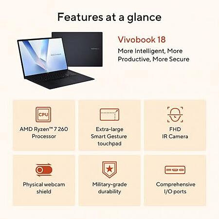 Features:- The ASUS Vivobook 18 combines powerful AMD Ryzen 7 performance, 32GB DDR5 RAM, and 1TB PCIe Gen4 SSD with a large 18" WUXGA IPS display for immersive visuals. With AI-powered Copilot, fast charging, all-day battery, and a sleek, durable design, it's perfect for productivity, entertainment, and multitasking on the go.