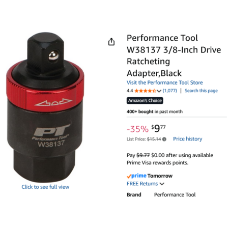 Performance Tool W38137 3/8-Inch Drive Ratcheting Adapter, Black. Free Shipping w/Prime or $35+.