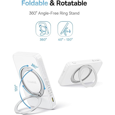 - Multi-Function Stand: The wireless portable charger features a built-in magnetic ring stand with strong magnetic alignment for stable snap-to-charge. The inner metal ring rotates 360° and adjusts freely from 40° to 120°.
