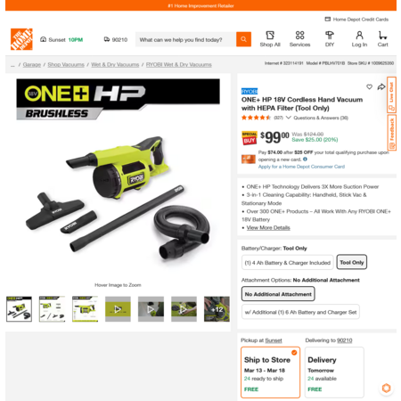 RYOBI ONE+ HP 18V Cordless Hand Vacuum with HEPA Filter (Tool Only) $99