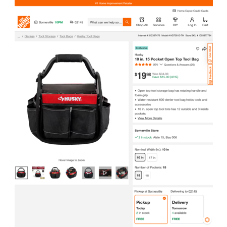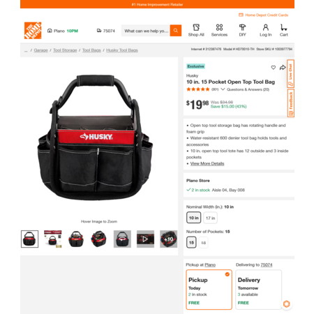 YMMV - Select Home Depot Stores: Husky 10 in. 15 Pocket Open Top Tool Bag. Free Delivery. $19.98
