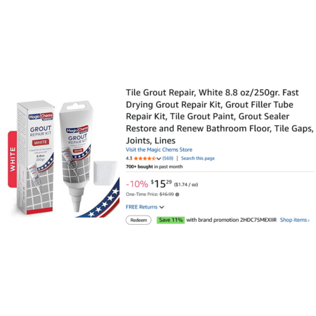 Magic Chems Tile Grout Repair, 8.8 oz/250gr. Fast Drying Grout Repair Kit, White, Beige, Cream or Grey. YMMV - Coupon Price $13.42