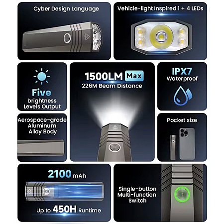 • 1500 lumens and 12,800 candella with 226 meter reach