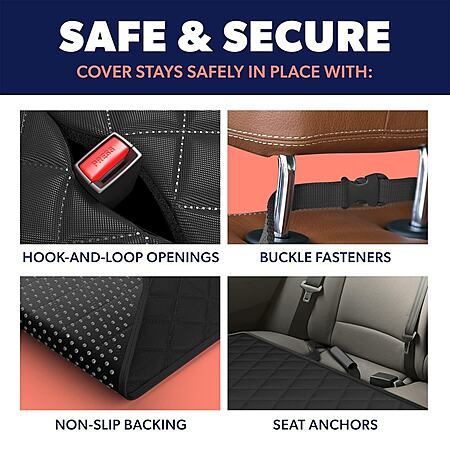 - Four built-in safety features—including headrest buckles, seat anchors, a non-slip backing, and a Velcro seatbelt opening—keep your pet secure and your whole family riding safely