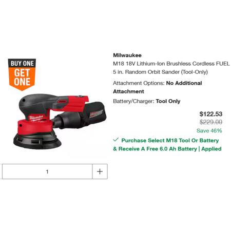 3. Either return or don't pickup the Milwaukee M18 18-Volt Lithium-Ion High Output Battery Pack 6.0Ah and you end up with the Milwaukee M18 18V Lithium-Ion Brushless Cordless FUEL 5 in. Random Orbit Sander (Tool-Only) for $122.53.