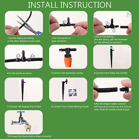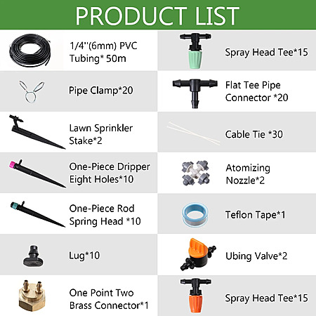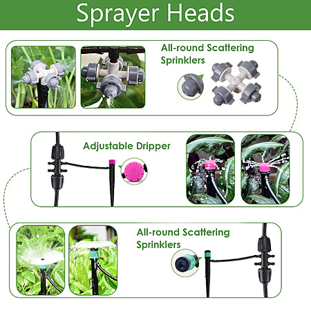 • Versatile Sprayers: Drip irrigation system includes 4 types of sprayers: adjustable atomizing nozzle, 4-hole sprinkler, 8-hole drip emitter, and all-round scattering sprinklers.