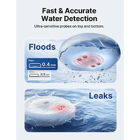- Detects Leaks Earlier, from More Angles: Designed with 6 ultra-sensitive probes—2 on top to catch dripping leaks and 4 on the bottom to sense pooling water; this sensor provides added protection where many standard detectors only monitor from below; detects moisture as thin as 0.4 mm, alerting you sooner than typical 0.5 mm sensors, before minor leaks turn into costly damage