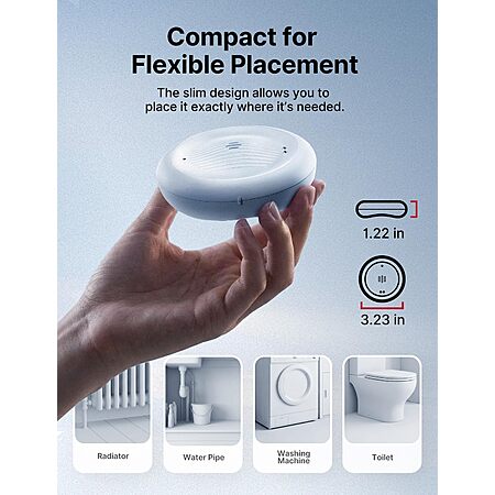 - Compact, Waterproof, Easy to Place: Measuring just 3.23 × 1.23 in (82 × 31.2 mm) and rated IP66 for water resistance, this smart water leak detector fits easily into tight or damp spaces—such as under washing machines, water heaters, or dishwashers; inside bathroom cabinets; and in basements, garages, RVs, boats, or vacation homes.