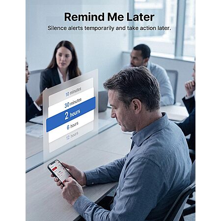 - Alerts You Won't Miss—or Ignore: View alert history, manage alarms, and receive low-battery notifications in the app; with Remind Me Later, you can reschedule alerts for 10 min, 30 min, 2 h, 6 h, or 12 h, and important alerts come back at your chosen time so you can take action later