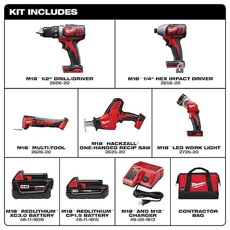 The MILWAUKEE M18 5-Tool Combo Kit includes the M18 1/2" Drill Driver (2606-20), M18 1/4" Hex Impact Driver (2656-20), M18 HACKZALL One-Handed Recip Saw (2625-20), M18 Cordless Multi-Tool (2626-20), M18 Work Light (2735-20), M18 REDLITHIUM 3.0 Ah Battery , M18 REDLITHIUM 1.5Ah Battery, M18 & M12 Multi-Voltage Charger (48-59-1812), and a contractor bag. All of the tools feature Milwaukee-designed motors for longer life and best-in-class power and speed. REDLINK Intelligence provides users with optimized performance and overload protection using total system communication between the tool, battery, and charger. M18 REDLITHIUM Batteries are compatible with 250+ Tools on the MILWAUKEE M18 System.