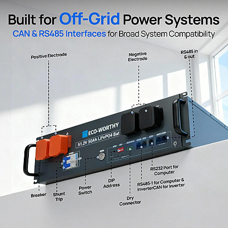 • [Advanced Communication Options] The ECO-WORTHY 48V 50Ah battery supports both Bluetooth and Wi-Fi, enabling real-time battery monitoring through a mobile app or PC software. Equipped with RS485, CAN, and RS232 ports, it integrates smoothly with most inverters for intelligent energy management
