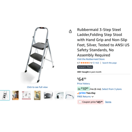 Rubbermaid 3-Step Steel Ladder, Folding Step Stool w/Hand Grip and Non-Slip Feet, Silver. YMMV - Coupon Price $45.49