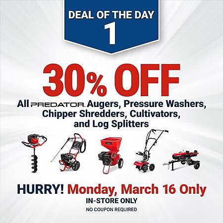 30% off all Predator Power augers, pressure washers, chipper shredders, cultivators and log splitters