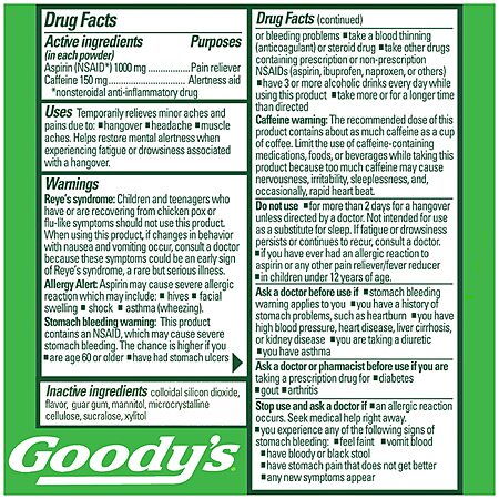 - Goody's Hangover powder stick packets provide fast, multi-symptom hangover relief by temporarily relieving minor aches and pains and restoring mental alertness