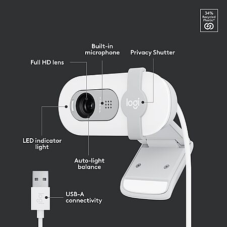 Logitech Brio 100 1080p Full HD Webcam (White) $24.99 + Free Shipping w/ Prime or on $35+