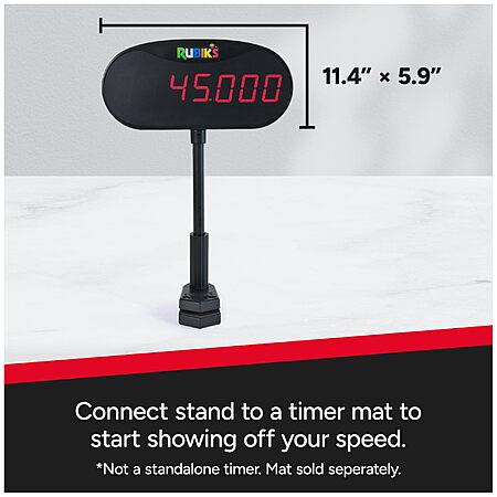 - Speedcubing Display Device: For seasoned or beginner Cubers, get WCA competition-ready & practice with the right equipment from Rubik's Cube to accurately keep time when every millisecond counts. Speed Cube Training: Measuring 11.4"x5.9," the large analog display is easy to read & adjustable mounting pole with clamp secures lightweight stand to any table. Timer Mat Sold Separately: Connect the Stand via the included data chord to a timing mat to start. Best used with the Rubik's Timer Mat & compatible with most third-party timer mats. Mat not included. What's Your Next Move: Love the thrill of taking on speedy solving challenges? Add to your Rubik's collection with Timer Mat, Mini Timer Stand, classic 3x3 Cube, 3x3 Speed Cube, 2x2 Speed Cube & more. Gifts For Puzzle Lovers: For players & collectors of brain teaser puzzles, fidget toys & puzzles for adults, Rubik's has cool stuff to add to gift baskets as gifts for men, gifts for teens & more. Includes: 1 Display Device, 1 Aux Cord, Instructions Covered by the Spin Master Care Commitment. See below for full details, Manufacturer: Spin Master