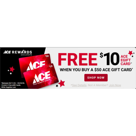*Between 3/6/26 and 3/18/26, spend $50 or more at acehardware.com, in the Ace mobile app or at participating Ace Hardware stores and receive a $10 bonus reward or spend $75 or more at acehardware.com, in the Ace mobile app or at participating Ace Hardware stores and receive a $15 bonus reward. Qualifying minimum purchase amounts are calculated minus discounts/coupons, rewards redemption and taxes. Bonus reward will be issued within 8 weeks of promotion end.