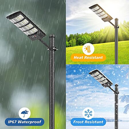 - [ DURABLE AND WATERPROOF FOR ALL ENVIRONMENTS ] Our IP67 waterproof LED street solar light is constructed with high-quality ABS and metal bracket, ensuring sturdiness and durability. This design is well-suited for outdoor environments, effectively withstanding challenges such as rainy days, high temperatures, low temperatures, and other harsh conditions. Choose our solar lights for reliable and efficient outdoor lighting.