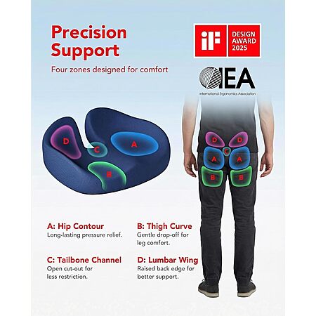 • Four-Zone Ergonomic Support: The chair cushion is expertly crafted to provide four specific support zones—hip contour, thigh curve, open tailbone channel, and lumbar support wings—shaped to mirror the natural form of your body. This pressure-relieving design helps reduce fatigue, discomfort, and stiffness. Perfect for those looking for seat cushions for office chairs or a pressure relief seat cushion for daily use.