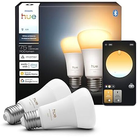 $41.24 | 2-Pack Philips Hue Smart LED A19 Bulb, White Ambiance, E26 Base, 9.5W, Full Spectrum Light 1000K-20000K, 1100 Lumens, Dimmable at Amazon