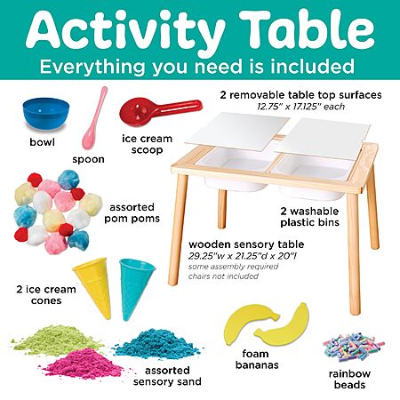 - The easy-to-assemble table features a removable tabletop surface and two removable, washable bins, allowing it to function as both a sensory bin table and a kids' art table.