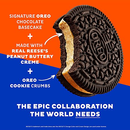 - You asked for it! The iconic brands of OREO and REESE'S have collaborated to create one delicious treat: OREO REESE'S Peanut Buttery Creme Chocolate Sandwich Cookies! These cookies feature creme filling made with real REESE'S Peanut Butter sauce and OREO cookie crumb inclusions sandwiched between two signature OREO chocolate wafer cookies. Sweet snacks for sharing with friends or enjoying solo, OREO REESE'S Peanut Buttery Creme snack cookies combine the best parts of both products – peanut butter and chocolate flavors – for the ultimate treat. Enjoy OREO REESE'S sandwich cookies on their own or with milk as after-lunch snacks. These tasty, fun snacks make wonderful birthday treats or movie snacks for a girls trip, game night, or movie night. The certified kosher OREO cookies also make fantastic office snacks or after-school snacks. With OREO REESE'S Peanut Buttery Creme Chocolate Sandwich Cookies, you'll be ready for any snacking occasion.