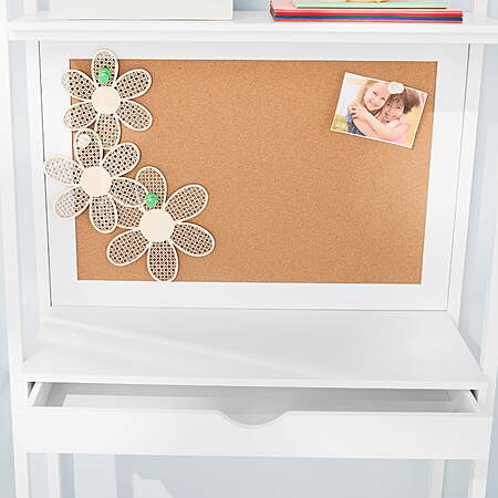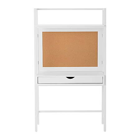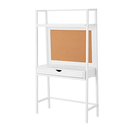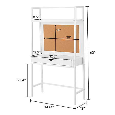 | Product Description: | Create the perfect workspace for your kids or preteens with this stylish and functional ladder-shaped desk. This space-saving desk combines modern, minimalist design with practical features, like a wide drawer, that keep everything organized and within reach. The built-in cork bulletin board is perfect for pinning notes, reminders, photos and more, and let’s your child add a personalized touch to their space. A fixed hutch offers ample room to display books, trophies, art, or collectibles. Great for homework, art projects, or creative play, this desk blends functionality with fun. The Build Your Own Furniture Ladder Desk is the ultimate addition to any kid’s room, helping them stay focused and express their personality—all in one stylish setup! Ladder desk with a built in cork bulletin board Features a fixed hutch with a display shelf Wide drawer with a rounded cutout handle Angled metal frame creates tapered shape Crisp white finish Assembled dimensions: 34.61" W x 13" D x 60" H (45.43 lbs) Drawer dimensions (interior): 29.25" W x 9.6" D x 2.4" H Top shelf dimensions: 32.5" W x 11.5" D for a coordinated look (sold separately) Desk top and top shelf can support up to 50 lbs each, drawer can support up to 22 lbs Attaches to the wall with included mounting hardware for safety Materials: manufactured wood & metal Adult assembly required (hammer, Phillips head screwdriver & flat head screwdriver needed) Package size: 64.37" x 25.91 x 4.02" (55.0 lbs) |