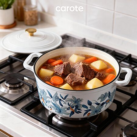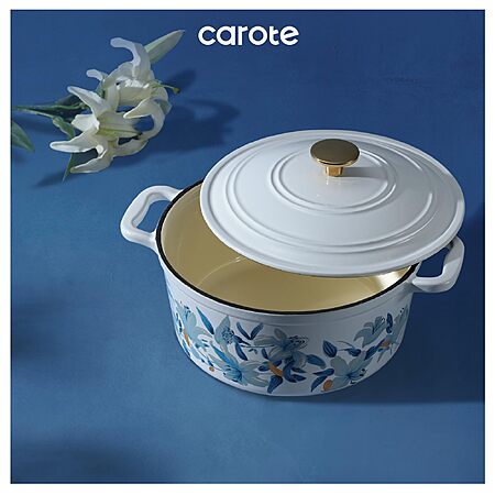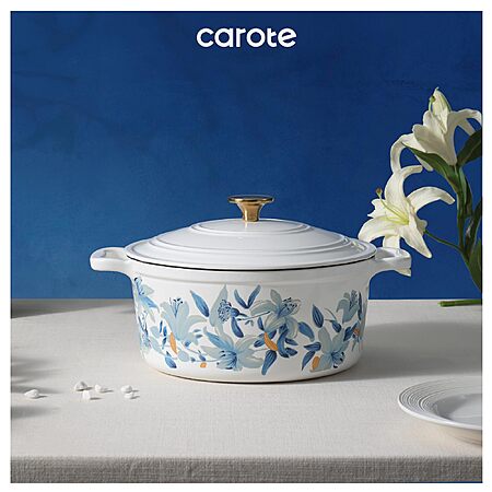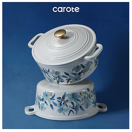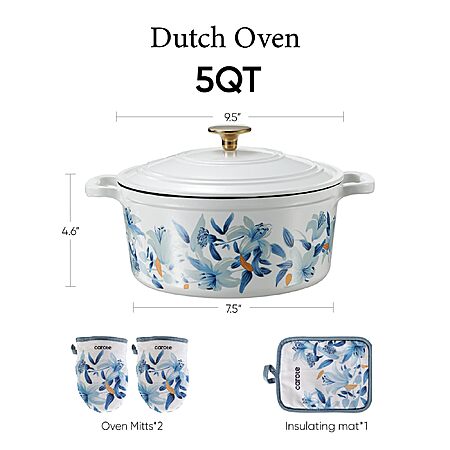 CAROTE 5 QT Cast Iron Dutch Oven Pot with Lid, Enameled Floral Dutch Ovens with Cotton Potholders & Oven Gloves, Gift Box White & Blue $49.97