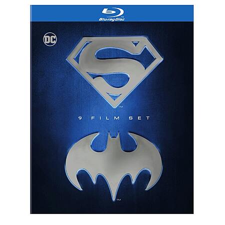 Batman/Superman Blu Ray set of Batman and Superman films includes Superman: The Movie, Superman II: The Richard Donner Cut, Superman III, Superman IV: The Quest for Peace, Superman Returns, Batman, Batman Returns, Batman Forever and Batman & Robin