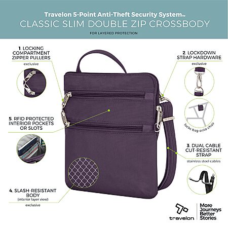 Travelon Anti-Theft Classic Slim Double Zip Crossbody Bag (Purple) $18.66 + Free Shipping w/ Prime or on $35+