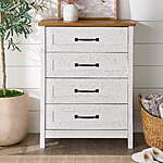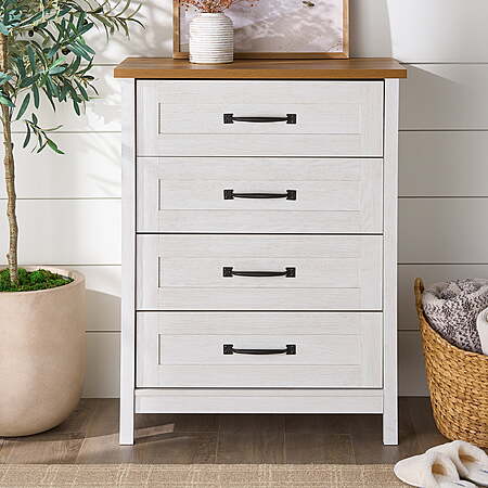 The Better Homes & Gardens® Modern Farmhouse collection presents a country dresser with a kiss of elegance. Finished in pale Alabaster®, with a Light Honey accented top, this 4-drawer chest evokes old-fashioned charm. This farmhouse dresser provides four spacious drawers with plenty of room to store a vast wardrobe - from bulky sweaters to casual t-shirts. This rustic bedroom chest has smooth metal runners and safety stops on each drawer to offer seamless access to clothing essentials, with plenty of storage room. Enhanced with an interlocking safety mechanism, only one drawer of this 4-drawer dresser can be opened at a time. A tip restraint safety strap is also included, ensuring additional peace of mind. This dresser with drawers emanates an old-world charm with a modern, cozy, and casual vibe. Bring a little bit of countryside calm into the bedroom with this rustic bedroom chest of drawers. Assembled Dimensions: L: 18.35" x W: 32.21" x H: 41.77" Four spacious drawers Drawers feature metal runners and safety stops Interlocking safety mechanism allows only one drawer open at a time Tip restraint safety strap included This chest complies with ASTM F2057-23 Standard Safety Specifications for Clothing Storage Units as required by the STURDY Act Alabaster finish with Light Honey accent Model #: 441384 Box Dimensions: L: 20.87" x W: 46.89" x H: 12.52" For additional questions or any issues, please contact the manufacturer at 1-800-523-3987. Be sure to check out the Better Homes & Garden collection for more great items!