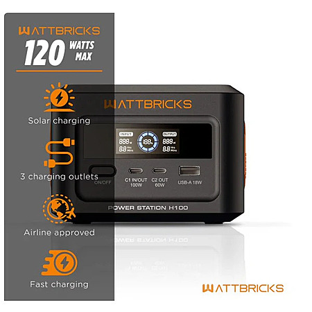 - Airline Approved Capacity: This portable powerstation is 99.2Whr, and compliant with UN38.3 shipping standards, which complies with TSA regulations (<100Wh) for carrying on airplanes as hand luggage. Weighing less than 2 lbs, the WattBricks 100 is tailored for flights and train travels, effortlessly fitting in your carry-on luggage.