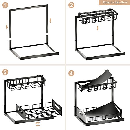 - 【Easy Installation】 No tools are required, just take a few seconds to connect the parts together to complete installation. Under bathroom sink organizer comes with bottom suction cups for added stability when in use.