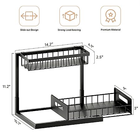 - 【Pull-out Storage Drawer】Kitchen sink organizer has a sliding drawer with handles on the bottom that pulls out smoothly for easy access to your bottom stored items. The bottom shelf can hold items up to 8.4" in height.