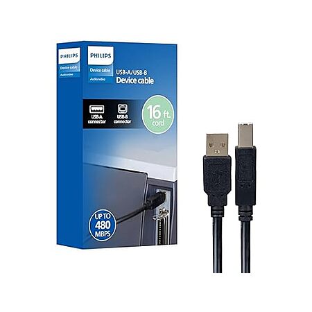 Philips USB-A to USB-B Printer Cable, 16 Ft Long Cord, Connect Laptop or Desktop, Data Transfer 480 Mbps, Gold Plated, $8