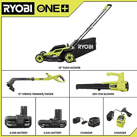 Ryobi ONE+ 18V 13 in. Cordless Battery Push Lawn Mower, String Trimmer, Blower w/ 4.0 Ah & 2.0 Ah Battery & (2) Chargers $279