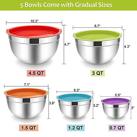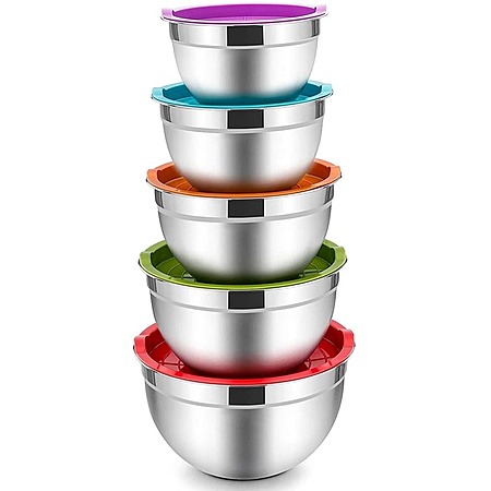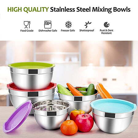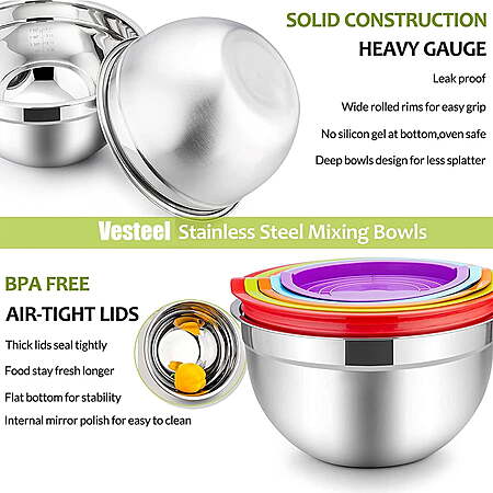 | Product Description: | Vesteel Mixing Bowls Set is constructed by commercial grade stainless steel, which is shatterproof, dent and rust resistant. The thoughtful design is their flat bottom and airtight lid, they are perfect to prevent bowls slipping and wobbling and keep the food seal airtight. These colorful mixing bowls comes with 5 different sizes, from small to large, which enable multiple ways of use, such as whisking eggs, mixing salads, kneading dough, serving soup, washing fruits and vegetables. Both bowls and lids can be nested well and convenient for storage, which is great for small kitchen. This kitchen aid stacking bowl set really makes a great housewarming gift! SPECIFICATION: Material: Stainless Steel & Food-Grade Plastic Color: Silver & Colorful Package included: 10-Pieces, 5 Mixing Bowls + 5 Lids Feature: Non-Toxic, Heavy Duty, Dishwasher & Freezer Safe, Great Tightness Craft: Mirror & Matte Finish, Tight Fitting Lids, Roll Rim SIZE & DIMENSION 0.7 QT Bowl: 5.5” Dia x 3” H 1 QT Bowl: 6.3” Dia x 3.2” H 1.5 QT Bowl: 7.1’’ Dia x 3.9’’ H 3 QT Bowl: 8.7’’ Dia x 4.3’’ H 4.5 QT Bowl: 10.2” Dia x 4.7” H HEALTHY MATERIAL - VeSteel mixing bowl set is constructed from high quality food grade stainless steel, Non-toxic colorful plastic lids, Rust and dent resistance bowls are dishwasher safe, Healthy and sturdy for family daily use, Durable for many years to come PRACTICAL DESIGNED - Deep bowls design is ideal for mixing without any splash, Wide rolled rims for easy and comfortable grabbing and pouring, One-piece molding, no need to worry about leakage, Thick airtight lids keep food stay fresh longer, Fridge and freezer safe EASY CLEANUP - Metal mixing bowls are designed a mirror finish inside and brushed finish outside for less fingerprint marks, Flat bottom for stability, No silica gel bowls can even be put into an oven, Easy to clean with no dead corner even by hand-washing, Lids hand-wash only NESTING & STACKABLE - Both stainless steel bowls and healthy plastic lids can be nested nicely, Bowls can be stored one inside the other (5 IN 1), Saving space in kitchen cupboards and convenient for storage and carrying, Great for home kitchen, bakery, restaurant, etc MULTI-USE - 5 different sizes of 4.5/3/1.5/1/0.7quarts allows you to measure, mix, pour and serve food all in one kitchen tool, Perfect for mixing, baking, cooking, serving or even as storage bowls, Ideal gift for Christmas, holidays, housewarming and other special occasions |